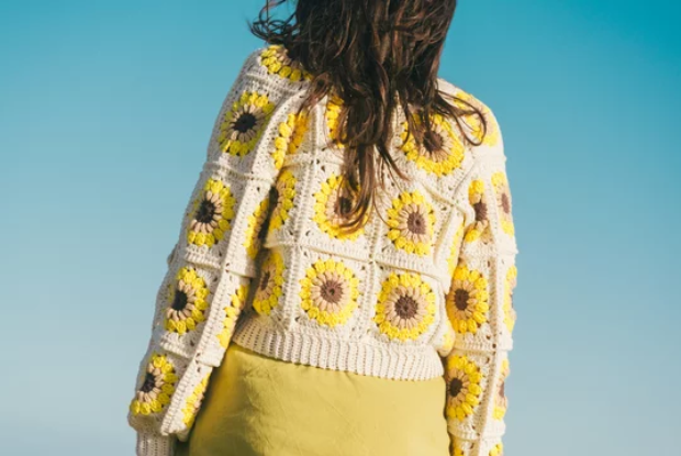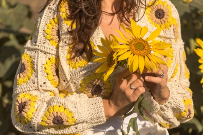 Casaco boho em crochet aos quadrados girasol