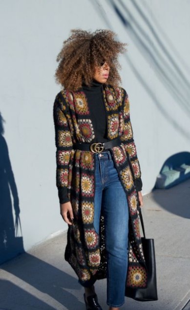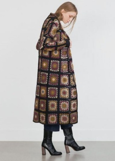 Casaco comprido de crochet aos quadrados feito à mão em lã, com um design base em preto e multicolorido.