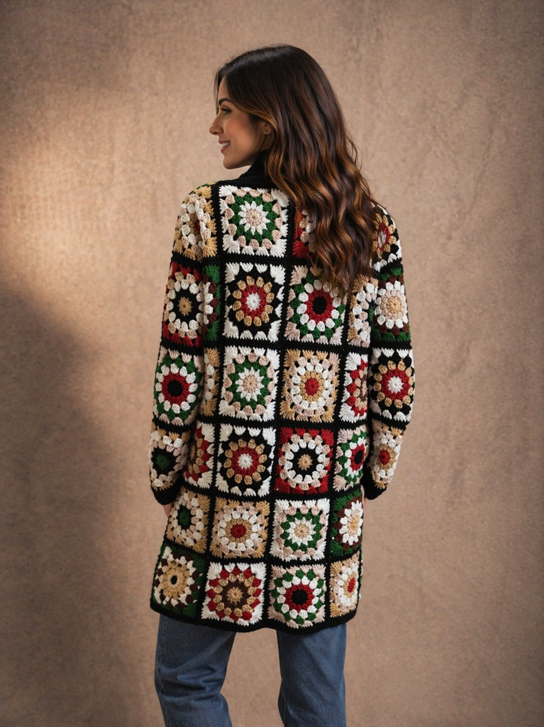 Casaco de crochet aos quadrados com cachecol feito à mão em lã, com um design base em preto e multicolorido.