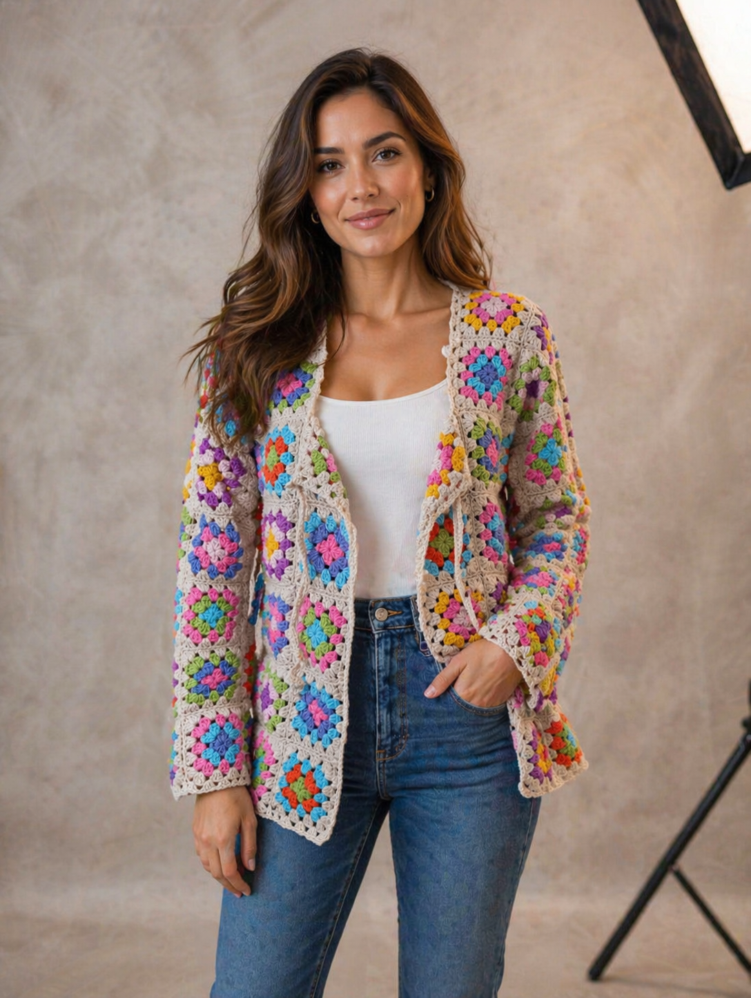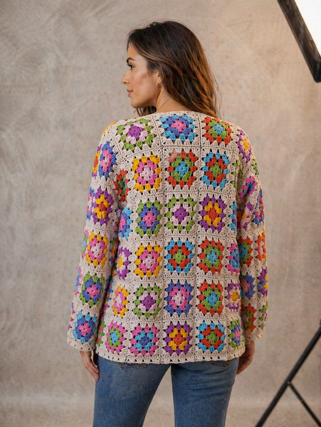 Com padrão de quadrados granny squares e um acabamento de qualidade.