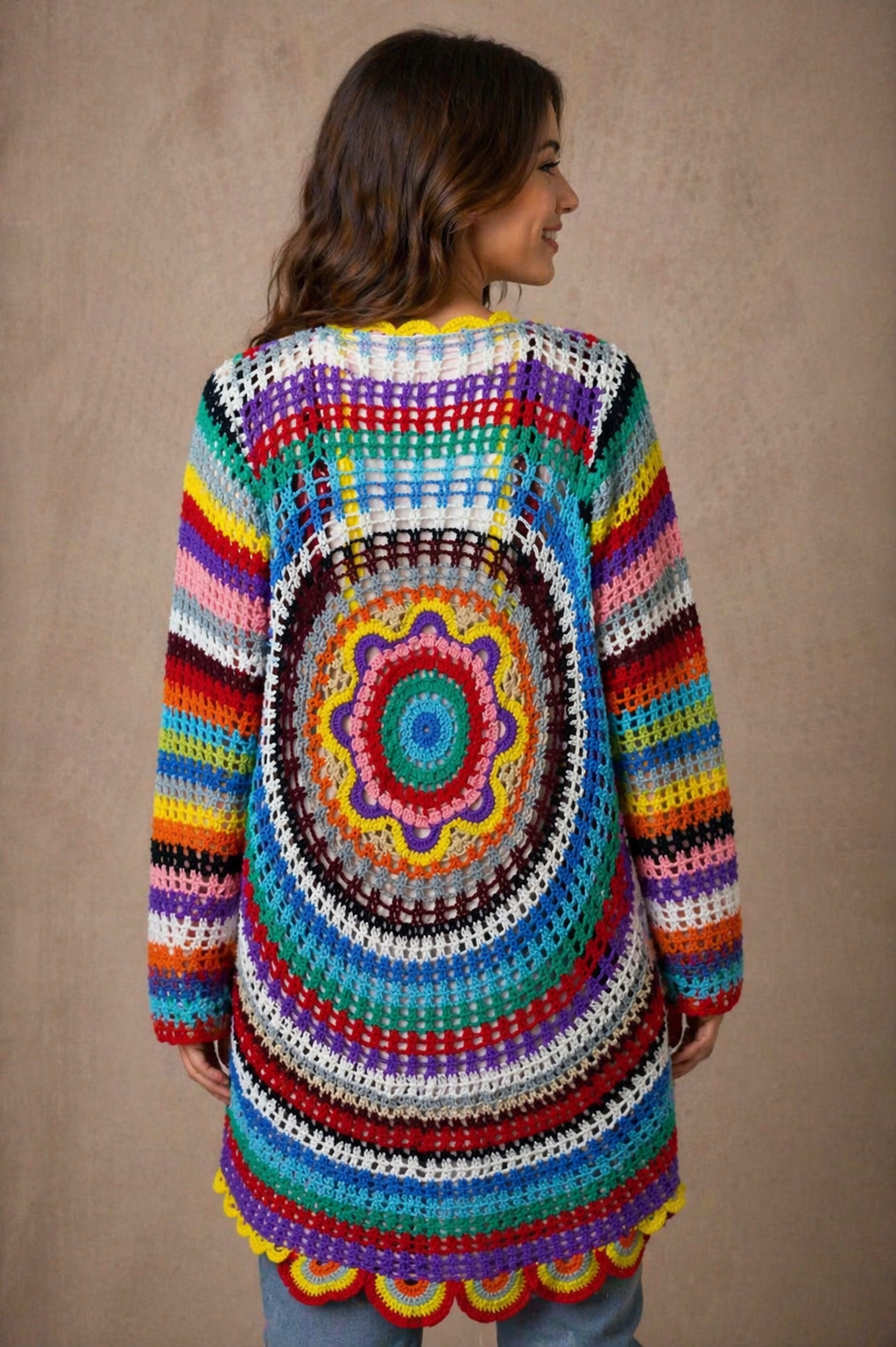 Casaco de crochet com mandala feito à mão com design vibrante e multicolorido.