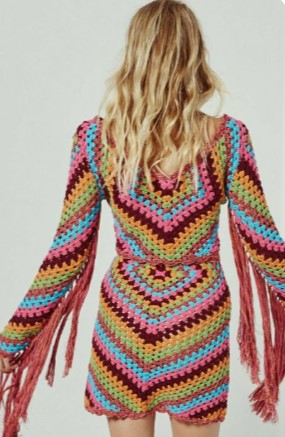 Conjunto de saia curta e blusa de crochê feita à mão, com um design vibrante e colorido.