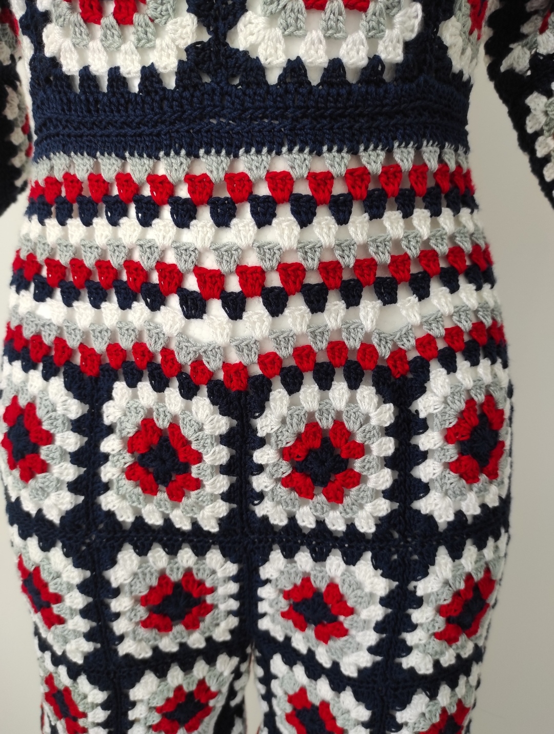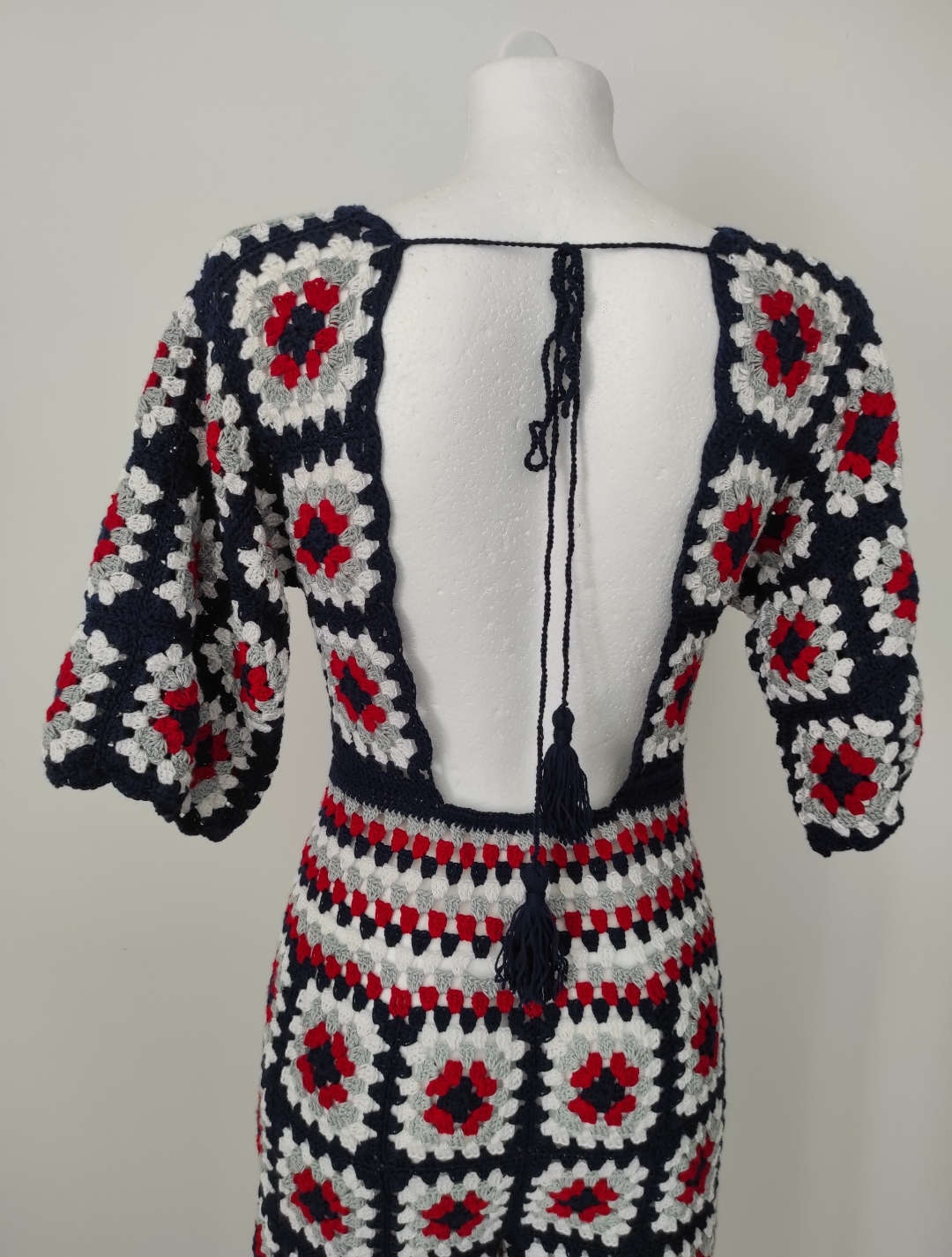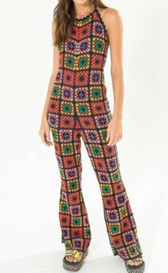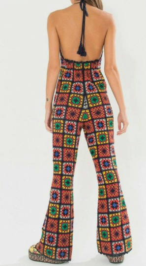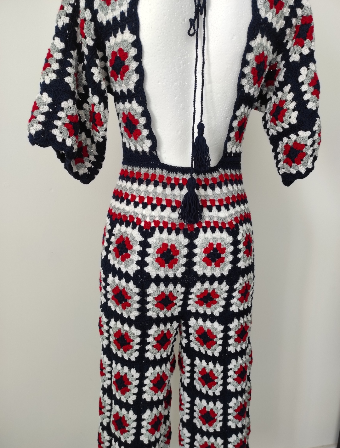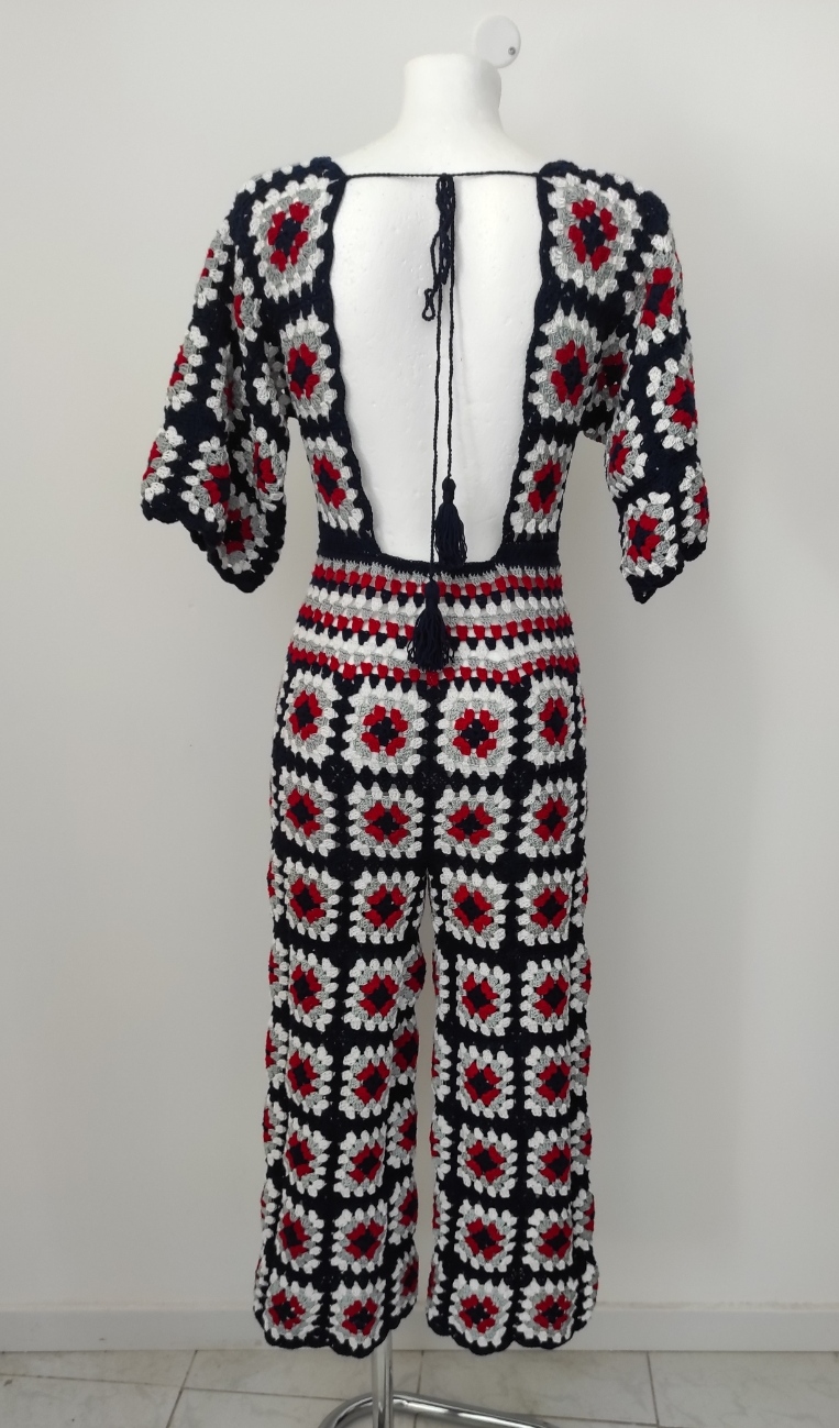 Macacão aos quadrados sem costas boho em crochet feito à mão em algodão.