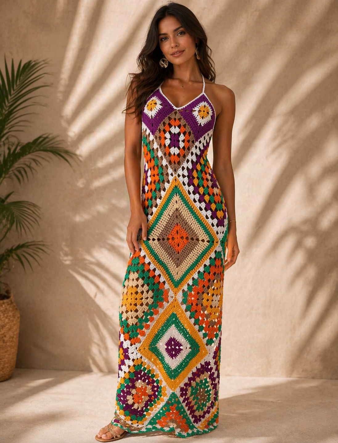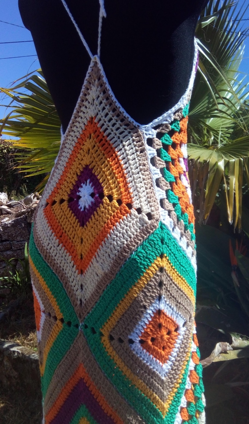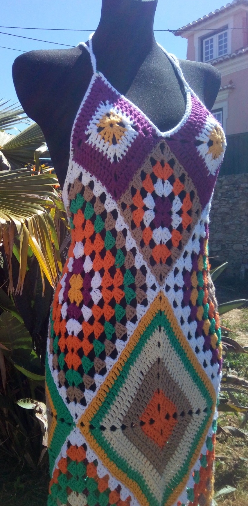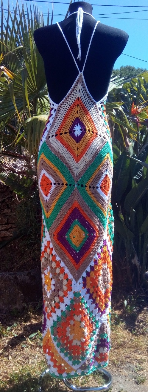 Vestido boho em crochet aos quadrados em algodão, sem costas
