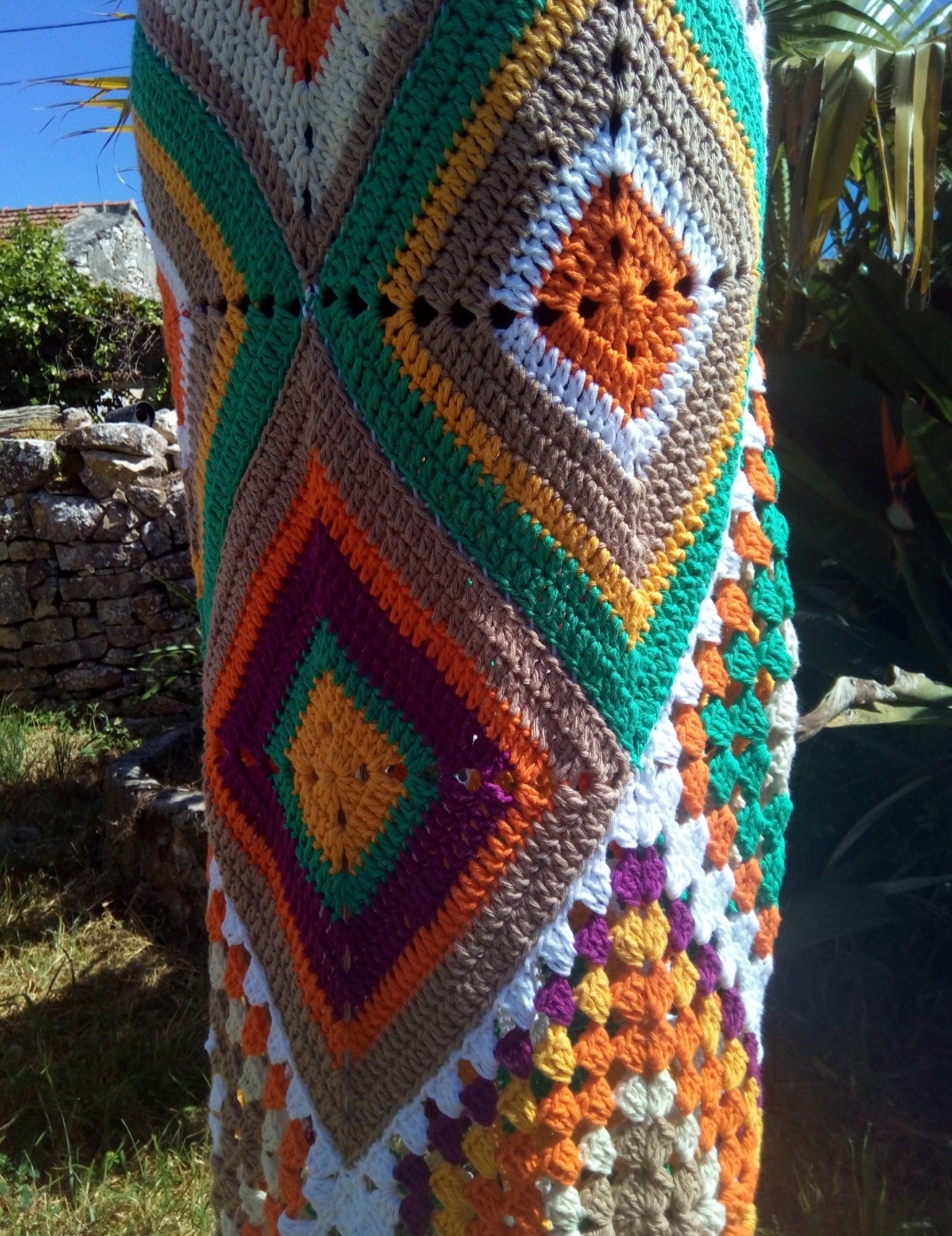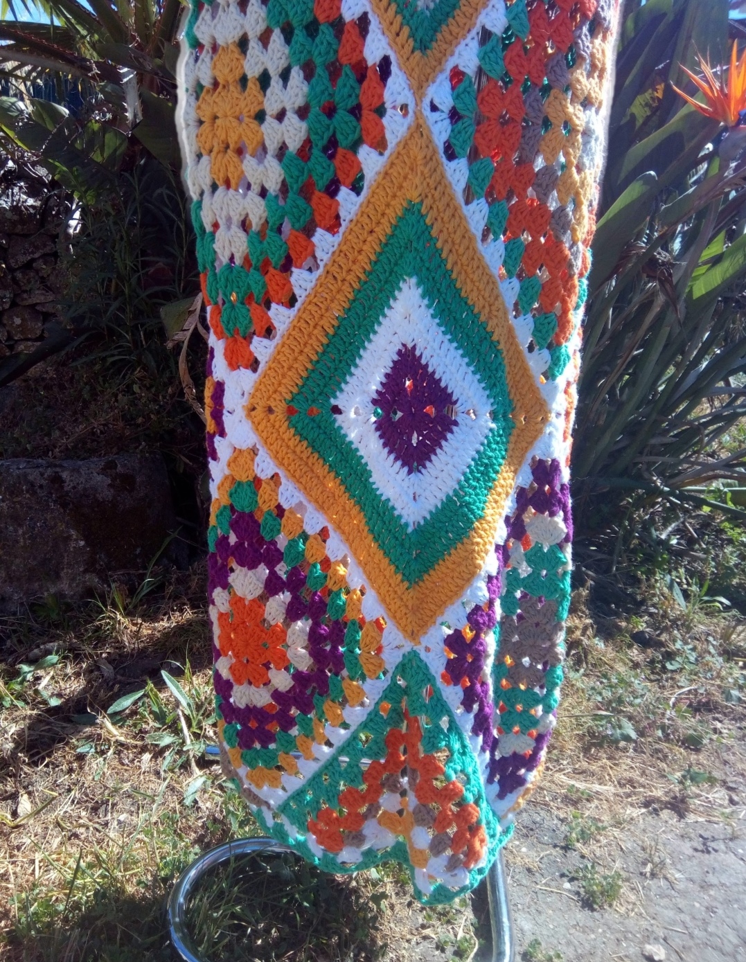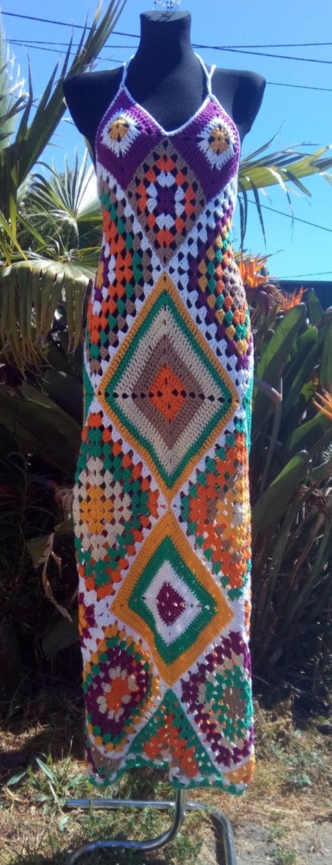 Vestido boho em crochet aos quadrados em algodão, sem costas