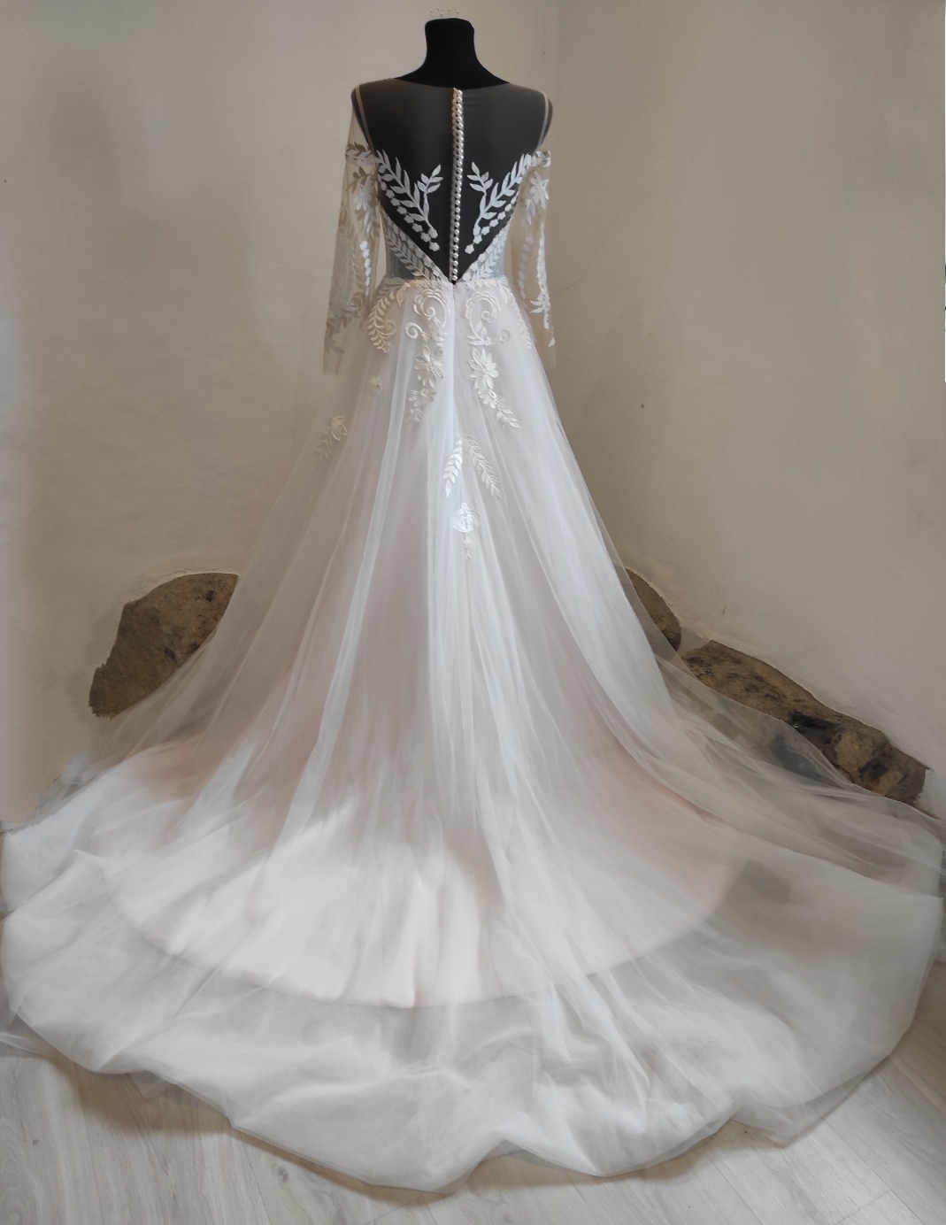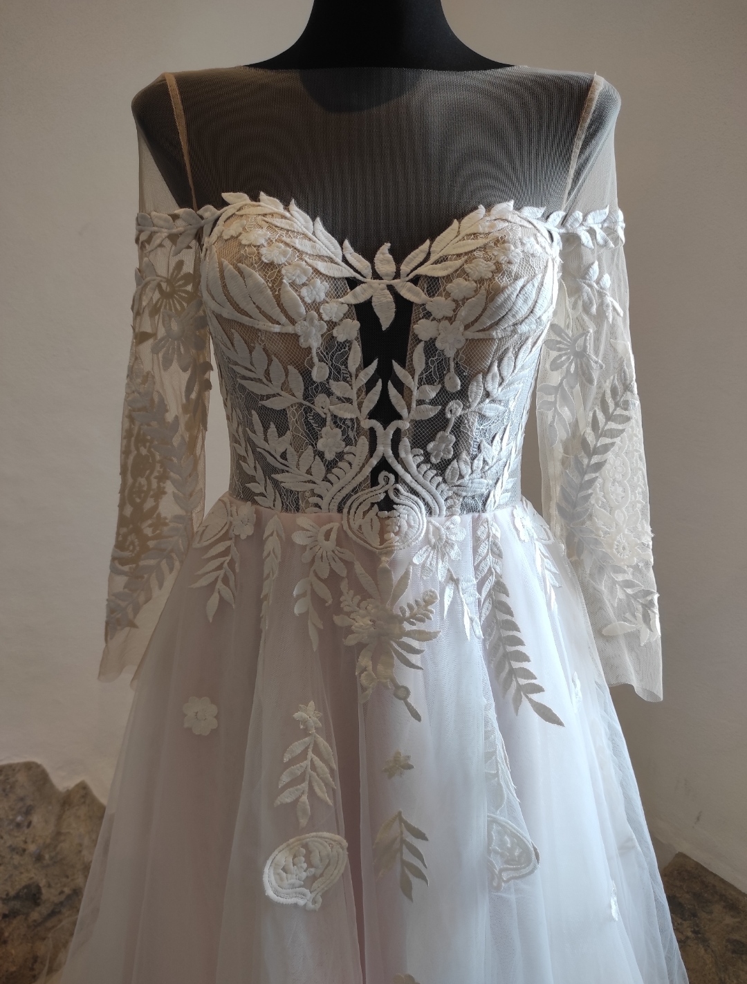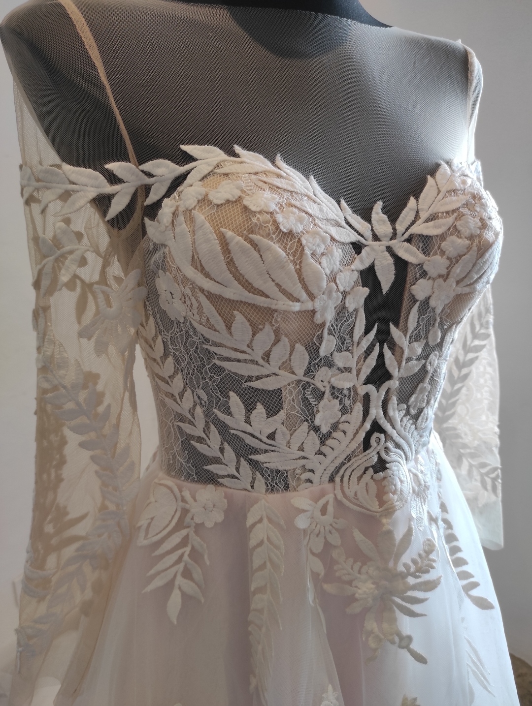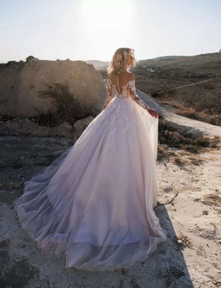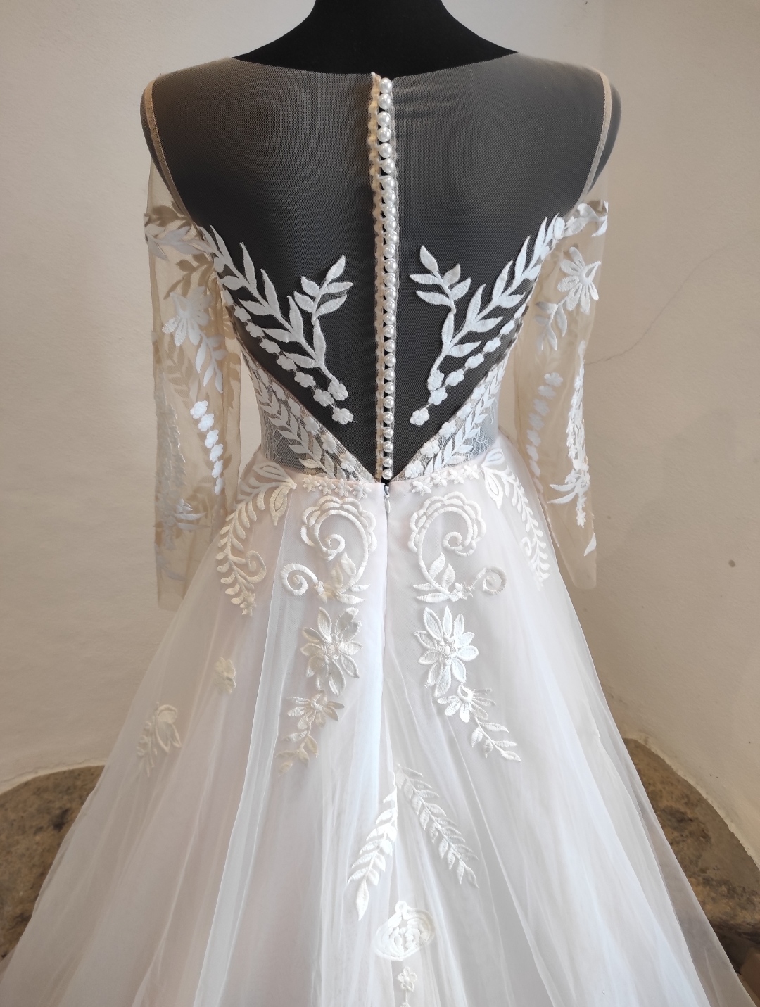 Vestido de Noiva Boho Chic | Decote em V Profundo Ilusão | Botões nas costas | Saia em Tule | Renda | Manga Comprida