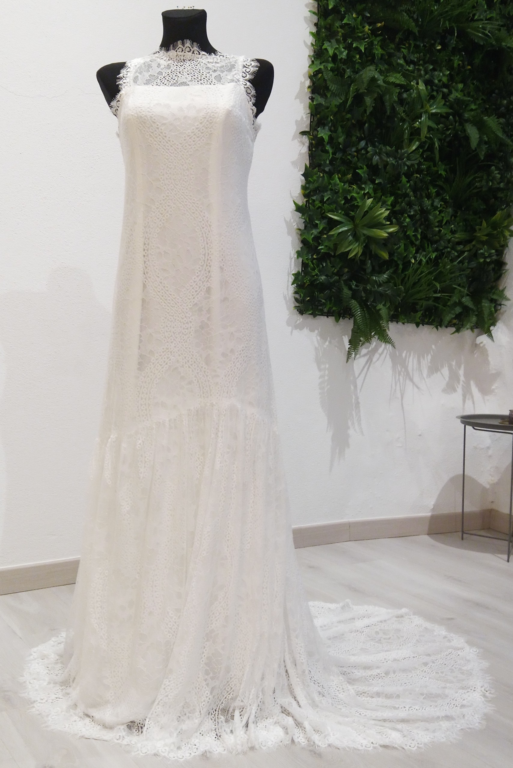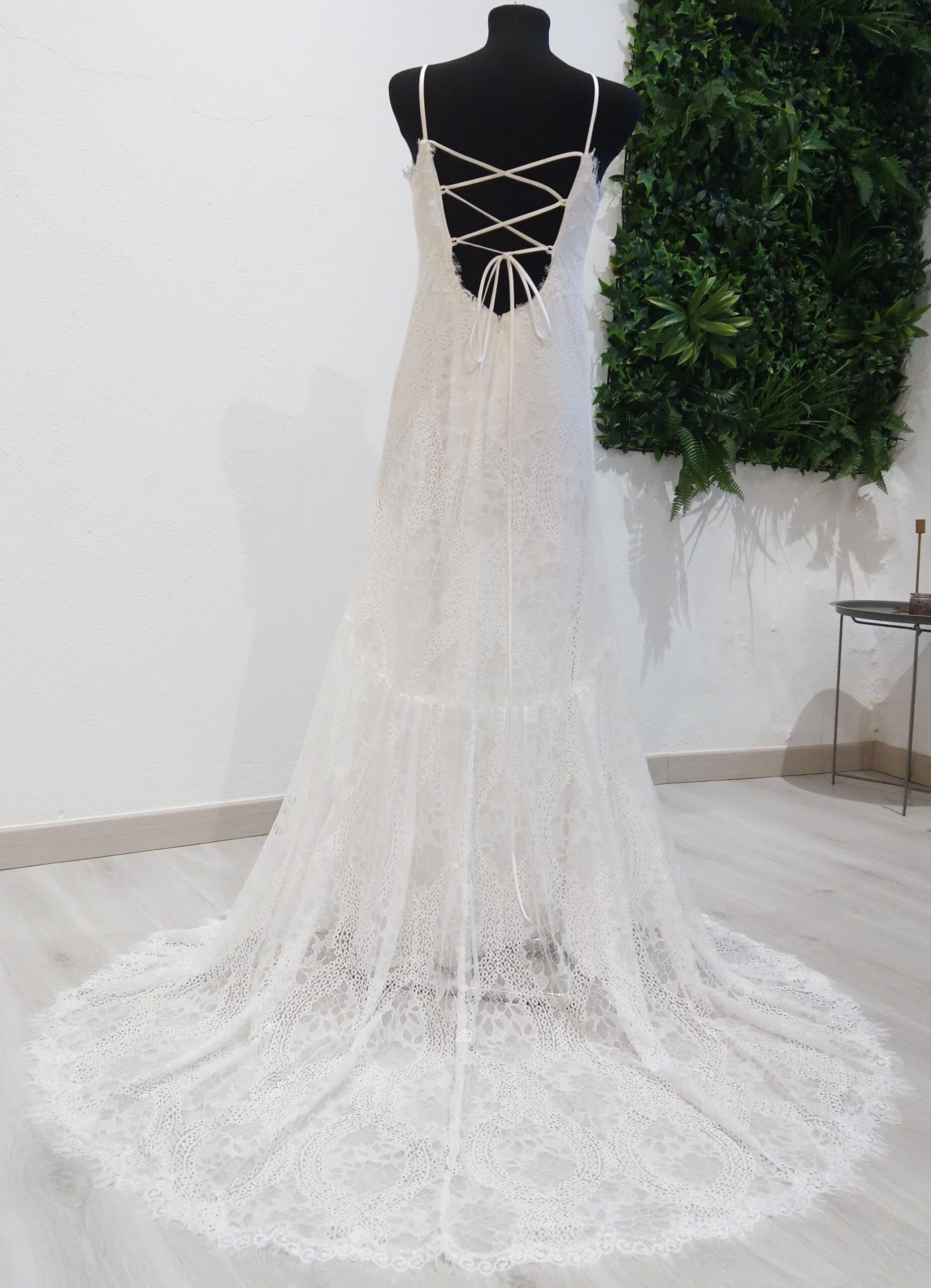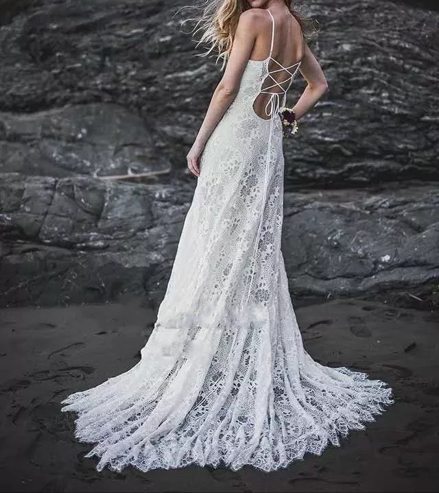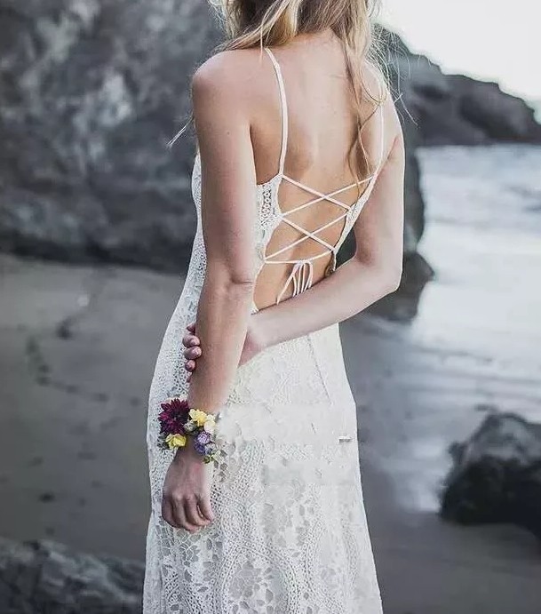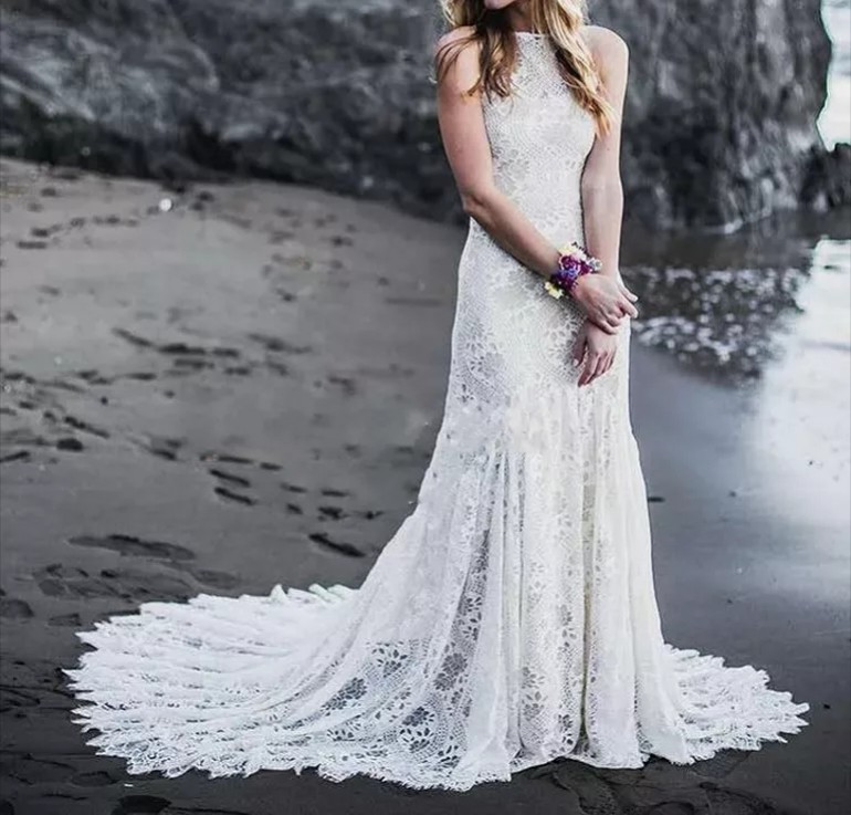 Vestido de Noiva Boho Chic | Decote Fechado | Renda Chantilly | Costas Abertas com alças finas Cruzadas