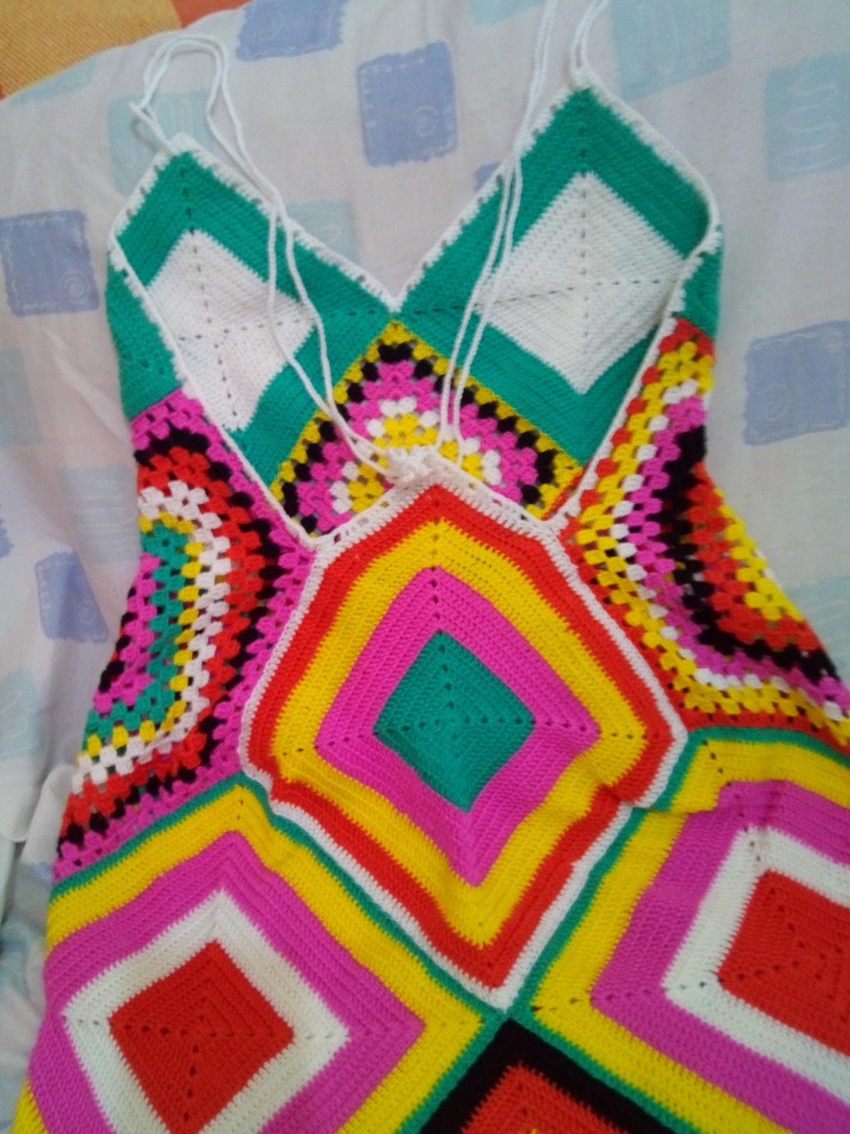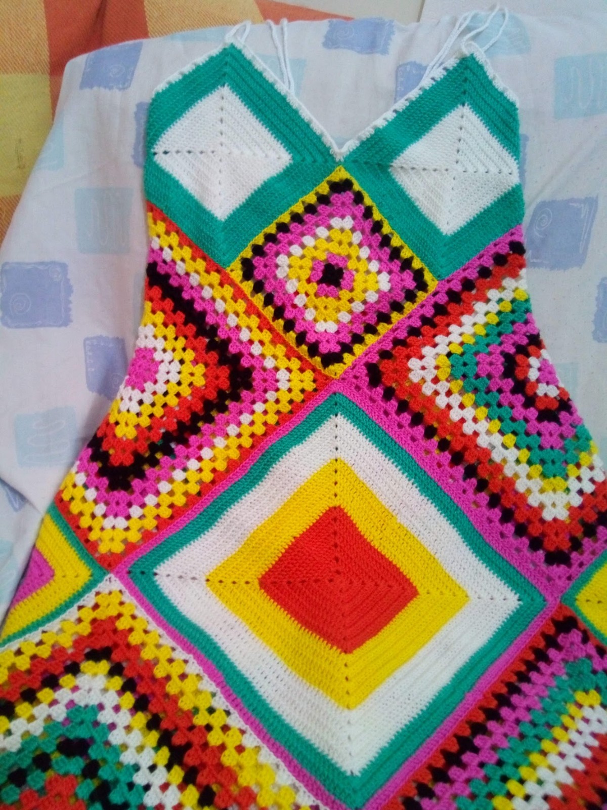 Vestido em crochet de alças e sem costas aos quadrados